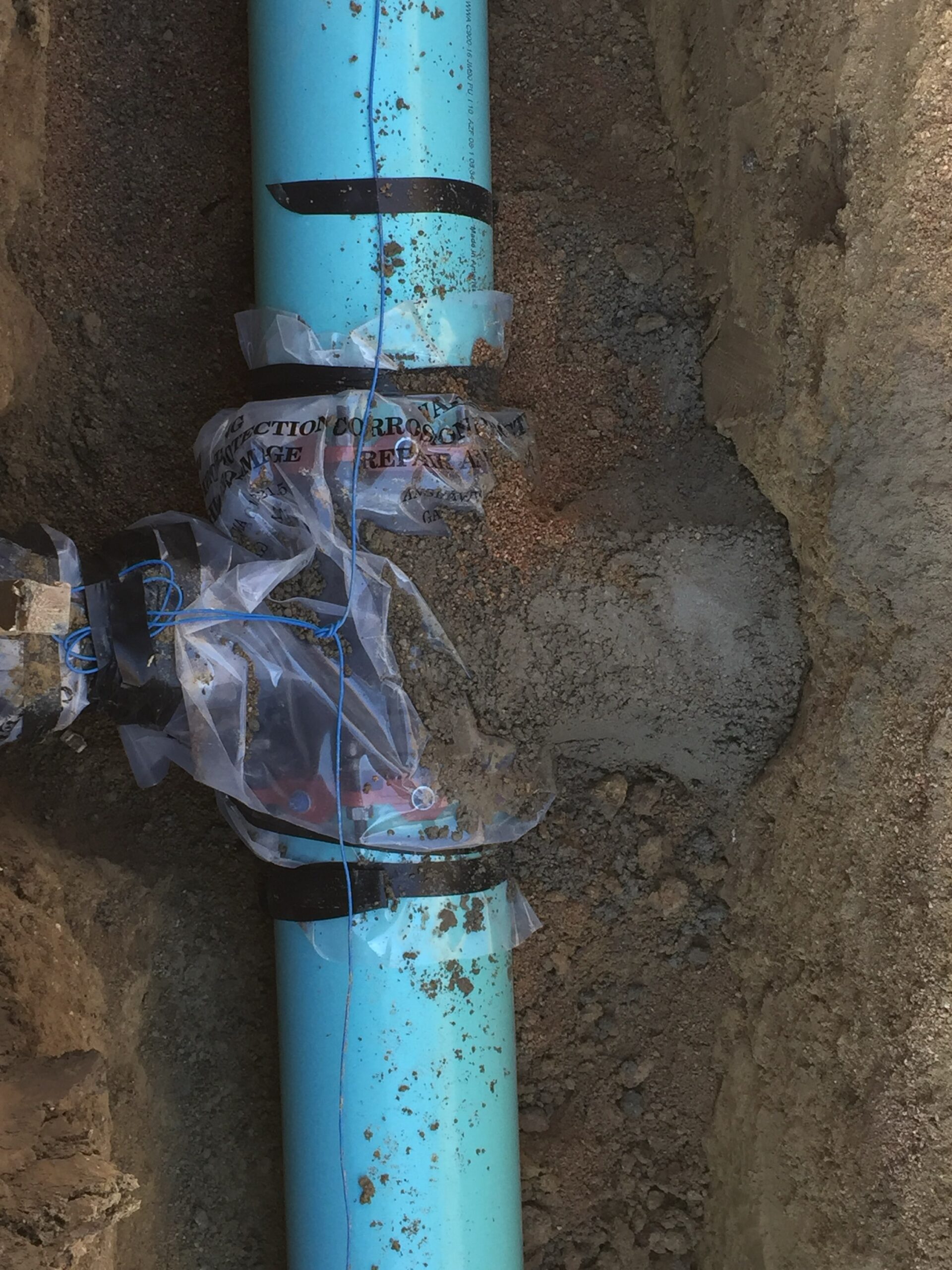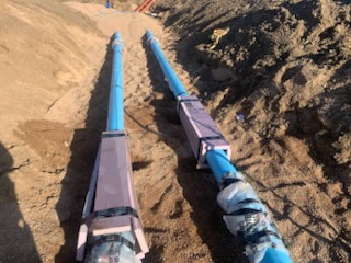 Parallel municipal water mains installed with protective casing and infrastructure supports.