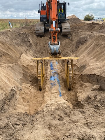 Excavator installing underground utility pipeline within a trench system for water or sewer infrastructure.