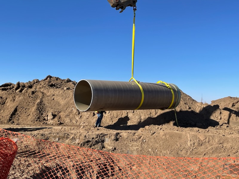 Crane placement of large diameter steel pipe used for municipal infrastructure systems.
