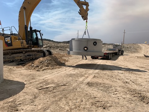 Placement of a large precast concrete utility structure for stormwater or sewer infrastructure.